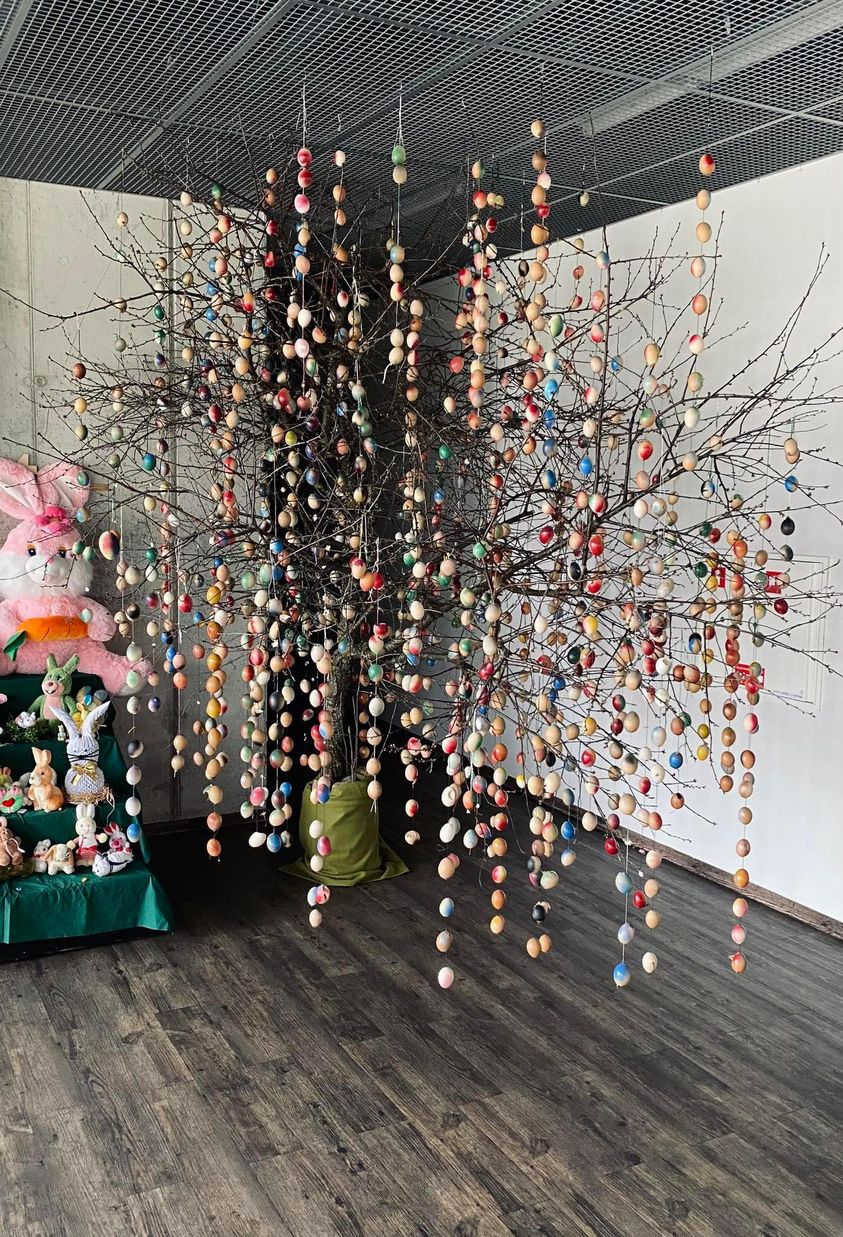 Šie kiaušiniai keletą metų puošė kultūros centro direktorės Svetlanos Jašinskienės namų kiemo medį, tačiau šiais metais džiugina mus kultūros centro foje! Tai direktorės rinkti, išpūsti, dažyti bei girliandomis sukabinti kiaušiniai. Ar įsivaizduojate, kiek kantrybės reikalauja šis įspūdingas darbas... :)